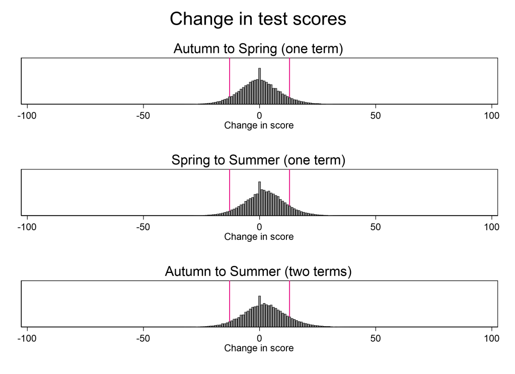 What’s notable from the graphs are how few pupils we can conclude (with 90% confidence) have changed their score at all. When we look at the change across one term (the top two graphs), only about one in twenty (5-7%) see a fall in test scores that can be detected with a well-designed test. When we look at change across two terms (bottom graph), this remains essentially unchanged at 6%.